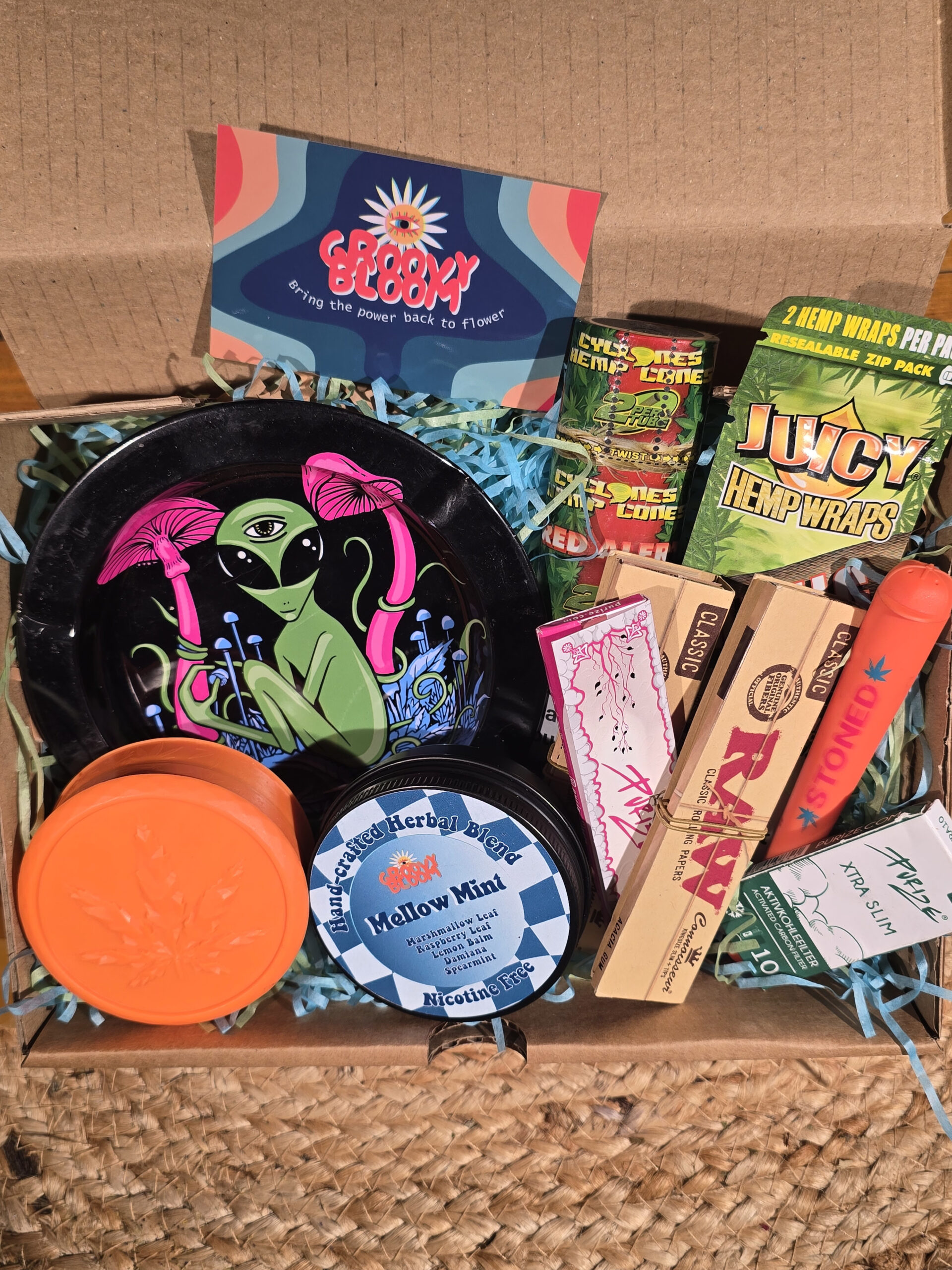 The perfect box for your favourite toker. set includes, a metal Ashtray, Grinder, 5x Papers, 1x Pack charcoal filters, 1x Doob Tube. Option to also add a blend of choice